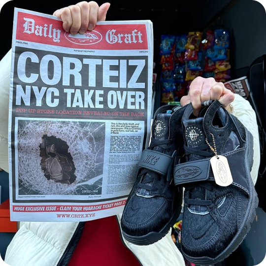 Masters of marketing, Corteiz created chaos with a campaign that had fans sprinting through the streets of London and Paris, eager to grab a pair of the elusive kicks. Enlisting football superstars Phil Foden and Eduardo Camavinga, they organised a crossbar challenge giveaway soundtracked by iconic 2005s grime. An old-school feeling met fresh talent to capture all ages - a testament to the brand's hype paradigm. Reinforcing the formula in December 2024, the pony-haired Huarache saw select newsstands across New York selling Corteiz NYC Take Over papers. It was the sneakerheads' ticket to cop the shoe, revealing drop locations and a ‘secret password’ to purchase. Needless to say, the Corteiz rush is real and loved for its anti-establishment ethos.